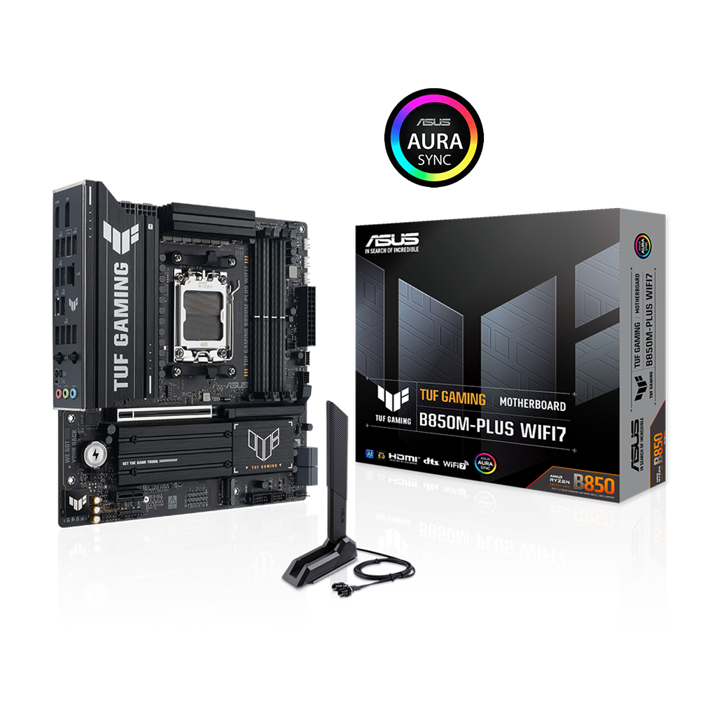 ASUS TUF GAMING B850M-PLUS WiFi tager alle de væsentlige elementer i de nyeste AMD Ryzen™-processorer og kombinerer dem med et væld af funktioner og dokumenteret holdbarhed. Dette bundkort er konstrueret med komponenter af militær kvalitet, en opgraderet strømløsning og et omfattende kølesystem og overgår forventningerne med en bundsolid og stabil ydelse.